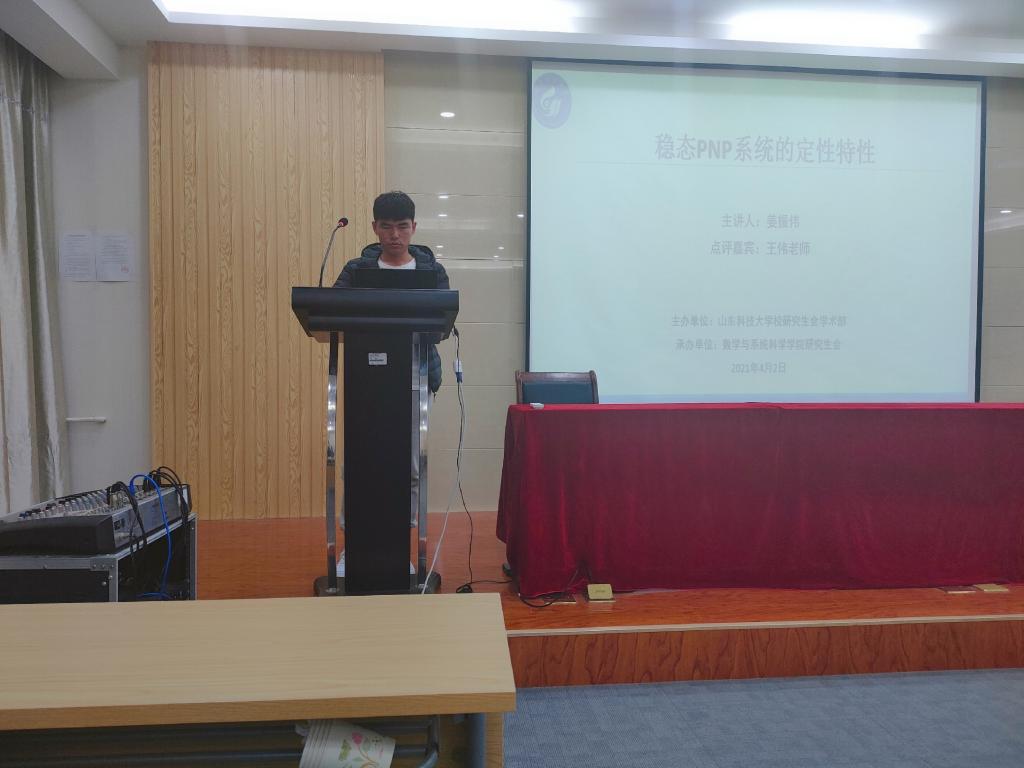 4月2日晚,数聚西海岸科学讲堂——研究生讲坛第137期在J9-433成功举办。信誉最好的十大体育平台2020级数学专业硕士姜振伟作了题为“稳态PNP系统的定性特性”的报告。本次讲坛邀请的点评嘉宾是信誉最好的十大体育平台王伟老师。公司50余名研究生参加了此次论坛,本次讲坛由科技部宋立凤主持。