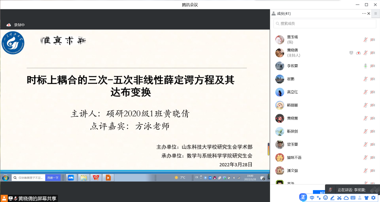 3月28日晚,数聚西海岸科学讲堂——研究生讲坛第173期在腾讯会议673-856-004成功举行。信誉最好的十大体育平台2020级数学专业硕士黄晓倩作了题为“时标上耦合的三次—五次非线性薛定谔方程及其达布变换”的报告。本次点评嘉宾是信誉最好的十大体育平台方泳教授。讲坛由科技部李玫霖主持。