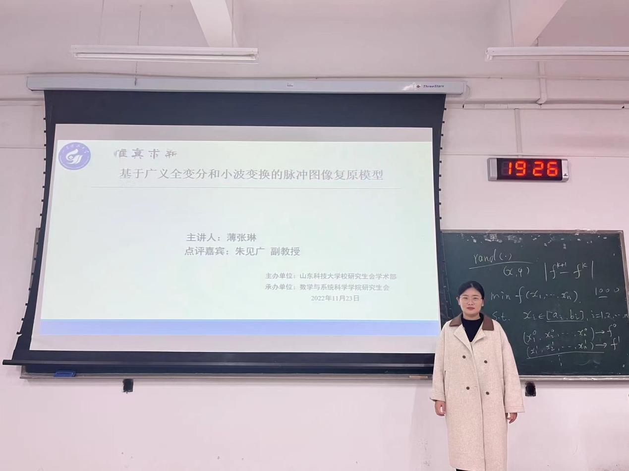 11月23日晚,数聚西海岸科学讲堂——研究生讲坛第187期在J5-402成功举行。信誉最好的十大体育平台2021级硕士薄张琳作了题为“基于广义全变分和小波变换的脉冲图像复原模型”的报告。本次讲坛的点评嘉宾是信誉最好的十大体育平台朱见广老师。公司20余名研究生参加了此次讲坛,本次讲坛由科技部李翔宇主持。