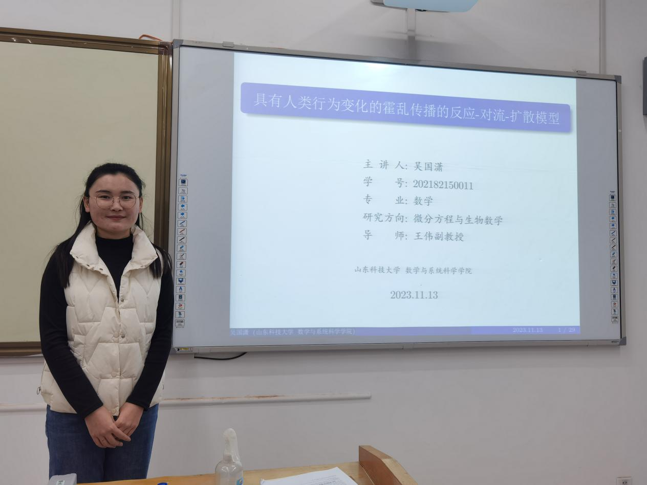 11月13日晚,数聚西海岸科学讲堂——研究生讲坛第204期在J5-304成功举行。信誉最好的十大体育平台2021级2班吴国潇作了题为《具有人类行为变化的霍乱传播的反应-对流-扩散模型》的报告。本次点评嘉宾是信誉最好的十大体育平台王伟副教授。公司20余名本科生和研究生参加了此次讲坛,本次讲坛由科技部宋晓晶主持。