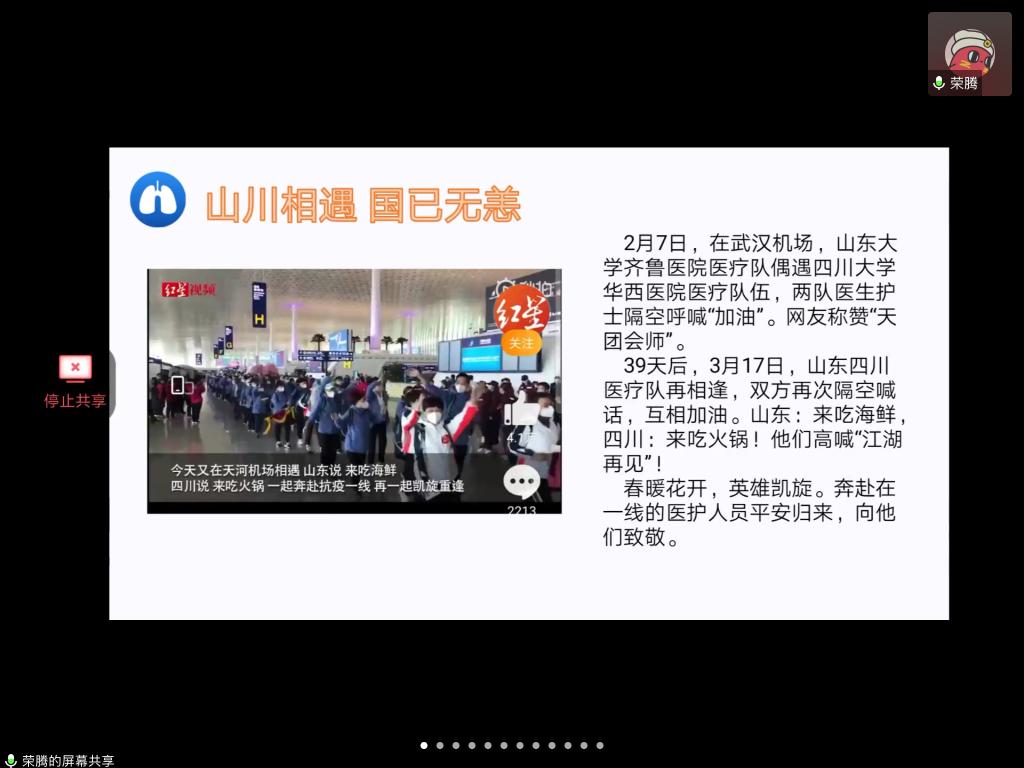 万众期盼中,完成驰援湖北任务的各省市医护人员分批返程回家。荣腾向同学们讲述了山东与四川赴湖北医疗队之间的故事,一幕幕感人的画面浮现在眼前。第一次相遇,那是数九寒冬,奔赴战场;第二次相遇,那是春暖花开,英雄凯旋。一起奔赴抗疫一线,再一起凯旋重逢,山东医疗队和四川医疗队的两次会师让人莫名感动。荣腾讲到,“山川相遇,国已无恙”,正是医护人员们这几个月以来不惧危险、日夜奋战的无私奉献,换来了如今疫情的有效控制,我们应该向他们致敬。