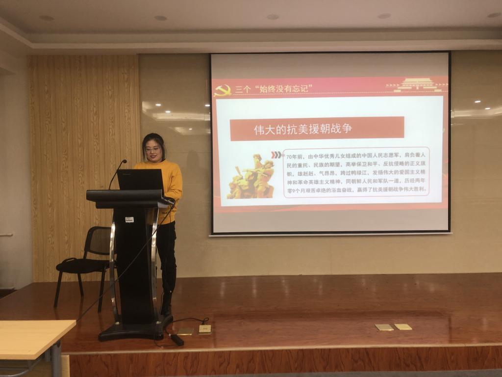 王继秋带领与会同学学习了习近平总书记在纪念中国人民志愿军抗美援朝出国作战70周年大会上的重要讲话精神,温故了抗美援朝战争胜利以来,中国在党的领导下发生的前所未有的历史巨变。任鹏旭介绍了抗美援朝战争的历史背景,号召同学们要以英雄的中国人民志愿军为榜样,学习他们为了祖国和民族而奋不顾身的爱国主义精神。他说,无论时代如何发展,我们都要汇聚万众一心、勠力同心的民族力量,把新时代中国特色社会主义伟大事业不断推向前进!