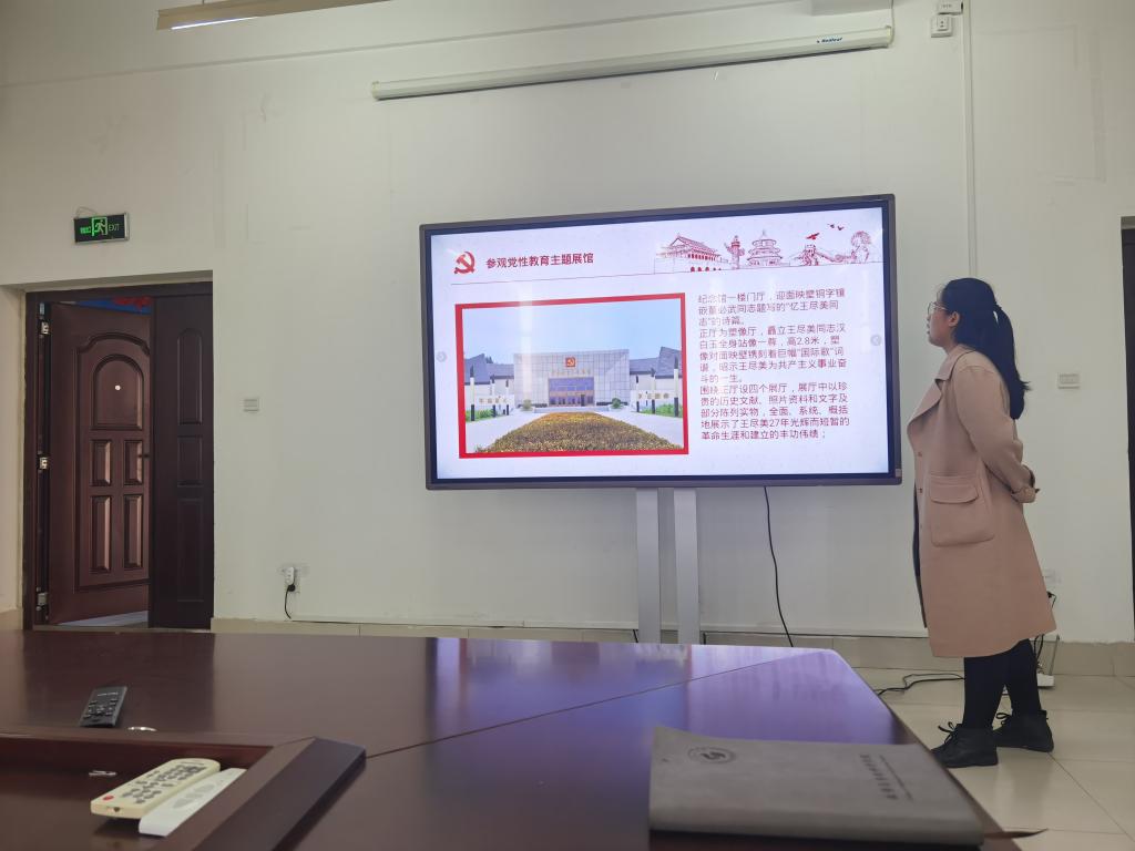 贾艺璇以丰富的历史照片和资料,详尽地解读了王尽美以身许国、践行初心的决心。她带领大家一同学习了王尽美刚满20岁时所作的诗“沉浮谁主问苍茫,古往今来一战场。潍水泥沙挟入海,铮铮乔有看沧桑。”在王尽美短暂的27年的生命里,即使恶病缠身,也依旧战斗在革命一线上,其遗嘱也感动了在座党员,大家的内心受到极大的震撼和鼓舞。