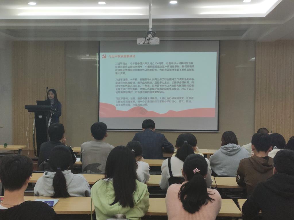 张若萱围绕习近平主席第七十六届联合国大会一般性辩论的重要讲话,带领同学们认真学习了中国为世界和平、全球发展、国际秩序等作出的重要贡献。她坚信,站在历史的十字路口,坚定信心、团结合作,人类定能携手应对全球性的威胁和挑战,推动构建人类命运共同体,共创光明的未来。