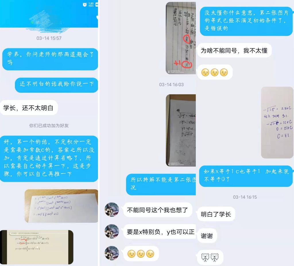 3月14日,《高等数学》课程讲到了微分方程的求解这一重难点,课后,大一员工赵景怡联系到党员邵珠浩,“学长,关于微分方程求解的知识点我还有一些疑问,你可以帮我解答一下吗?”邵珠浩不仅认真地解答了问题,还耐心地将知识点进行了梳理,便于赵景怡更好的掌握教学内容。自线上教学启动后,学霸助教团党支部就第一时间对接专业老师,带领全体助教深入云端课堂,认真做好课堂点名、作业批改、课后答疑等,工作覆盖全校321个教学班,101门课程,服务员工9585人次。