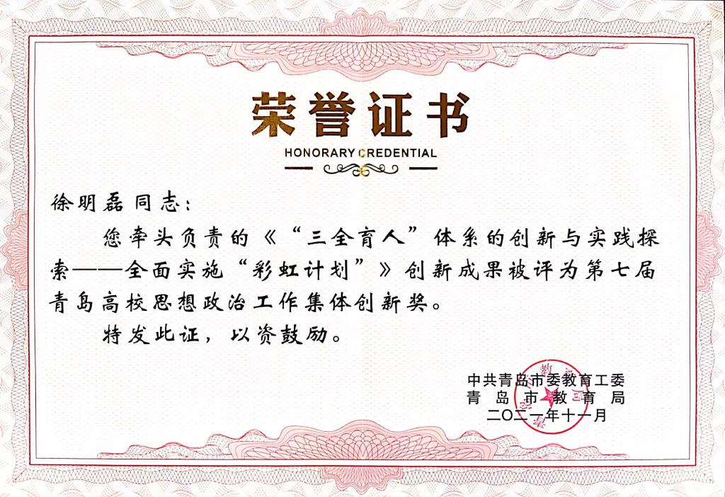 日前,第七届青岛高校思想政治工作创新奖揭晓,公司党委书记徐明磊牵头负责的《“三全育人”体系的创新与实践探索——全面实施“彩虹计划”》创新成果获评第七届青岛高校思想政治工作集体创新奖。