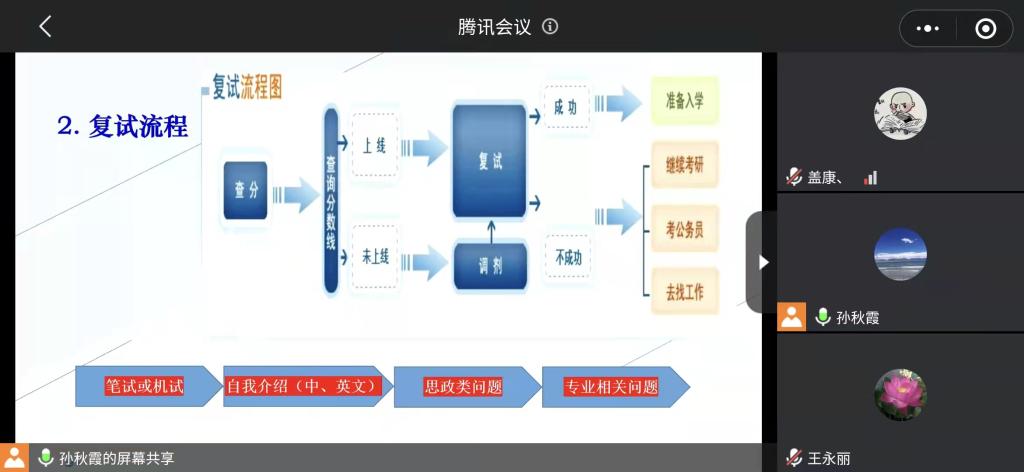 学霸助教团党支部主动邀请2021届成功考取研究生的优秀学子纪瑞、蔡督等七位同学来到线上为大家做考研复试经验分享,他们就同学们普遍关心的线上复试、公司调剂等问题作了详细讲解和答疑,建议同学们密切关注招生单位的复试要求,加强与招生单位的联系,充分做好线上模拟面试、设备调试等前期准备工作。