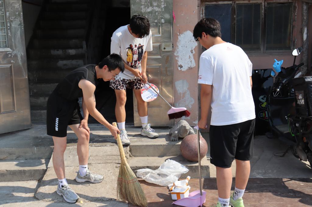 活动中,同学们重点清理了社区绿化带、健身广场和楼道等公共区域。大家分工协作,配合默契,有的同学手持垃圾袋,认真捡拾绿化带中散落的白色垃圾;有的同学则细心地擦拭着社区宣传栏,使其恢复光洁;还有的同学积极整理乱停放的共享单车,确保道路畅通无阻。尽管天气炎热,但同学们的热情丝毫未减,他们不放过任何一个卫生死角,用实际行动生动诠释了“奉献、友爱、互助、进步”的志愿精神。同时,同学们还与社区居民进行了亲切的交流,积极宣传环保理念,倡导大家共同维护美好家园。