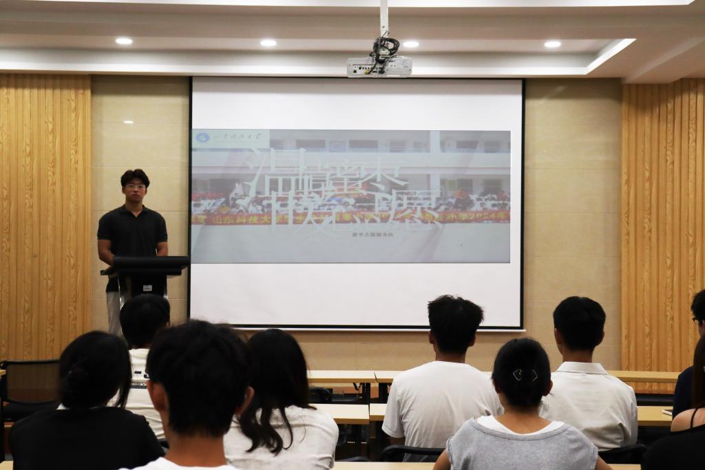 活动由团委老师贾梓霆致开场辞,他指出社会实践是青年将专业知识转化为社会服务能力的重要途径,号召员工以躬身实践的姿态融入乡村振兴战略,同时强调各实践团队要将人身安全置于首位,严格执行团队纪律,切实做好风险防控。随后,“蜜枣”志愿服务队负责人从基层政务协助、红色文化探访、乡村教育帮扶三个维度,以志愿队往年的实践经历,详细介绍了暑期“三下乡”社会实践项目,重点解读古城红色遗址调研、幼儿园公益课堂等特色模块。此外,往届优秀实践者以西海岸新区机关实习经历为例,讲解了“青鸟计划”返家乡活动及政务服务、企业实践等实习内容。