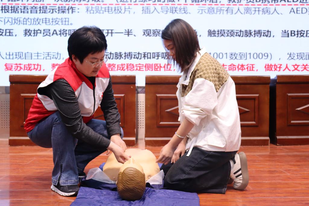 培训中,魏丽丽以2021年欧洲杯球员心脏骤停及2023年亚运会运动员突发晕厥等典型案例为切入点,结合“黄金四分钟”急救理论,讲解了科学施救对挽救生命的重要价值。系统传授了心肺复苏标准动作、AED规范操作及气道异物急救要点,帮助参训员工建立完整的急救知识体系。实践环节中,参训通过分组模拟急救场景开展技能实训,帮助员工精准掌握胸外按压的深度频率控制、AED规范操作等核心技能,切实提升急救实践能力。