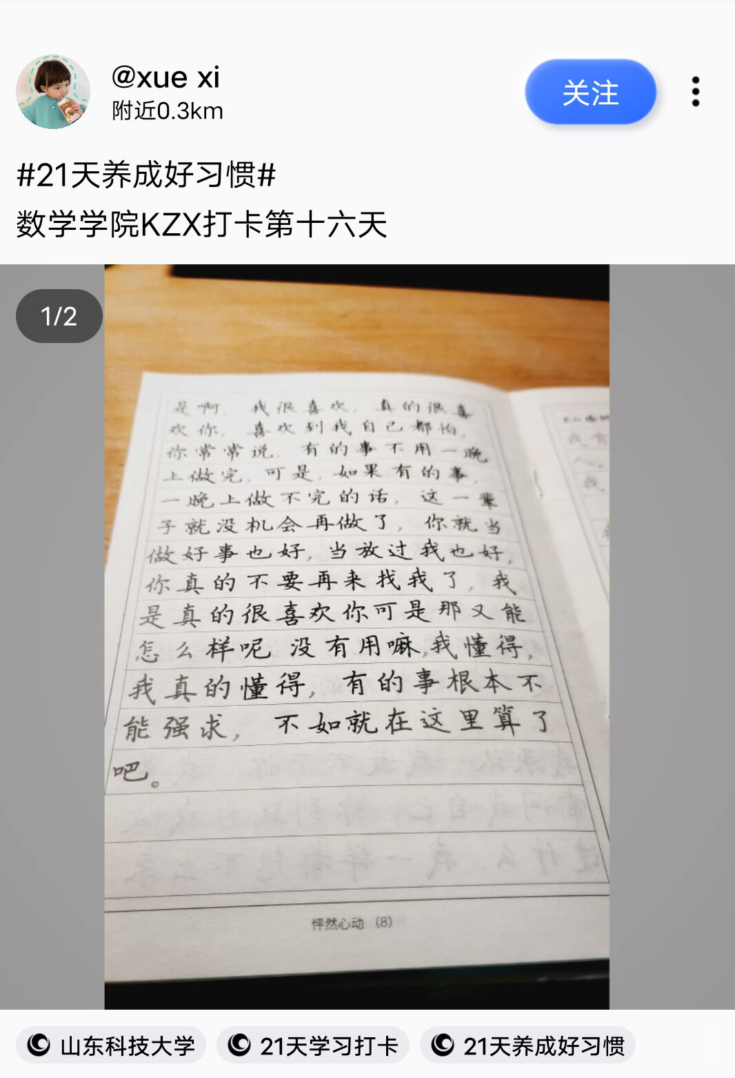活动分为四个部分:宿舍卫生——保持住宿环境干净整洁;个人学识——每天记录一道错题或好题,每天记单词或看书半小时;品德修养——坚持运动健身或培养兴趣爱好;热心助人:每天教同学一个知识点,或帮助同学解答一个难题。参与活动的同学采用线上打卡模式,并将截图发送给活动工作人员。本次活动参与同学共计107人,绝大部分同学圆满完成活动任务。
