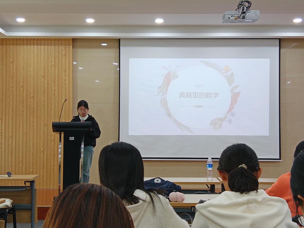 分享会上,参赛同学们通过 PPT 展示或演讲,分享了各自阅读数学典籍的感悟与收获。其中,李雨桐以通俗易懂的语言讲解了《九章算术》这一著作,深入地剖析了这其中的基本数学思想与应用,赢得了在场同学们的一致赞誉,荣获一等奖。郝翎伊和尚宸旭凭借出色的表现荣获二等奖,侯正航、梁天雨、陈思甜则获得三等奖。
