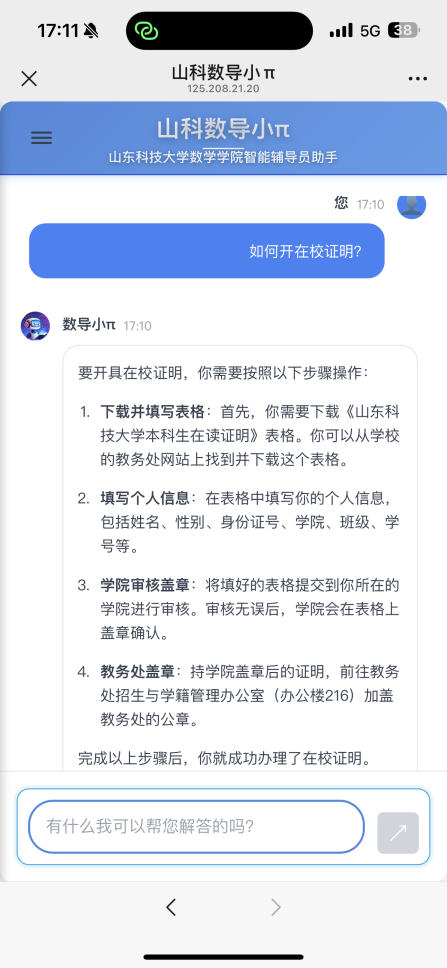 数据科学与大数据技术2024级员工王晓菲,近期需要开具在读证明,通过“数导小π”她第一时间获悉了开具在读证明的全流程。 “‘数导小π’真是太方便了,以后再遇到日常不知道的事儿我一定要先问问它,我也是山科百事通了!”王晓菲欣喜地说。