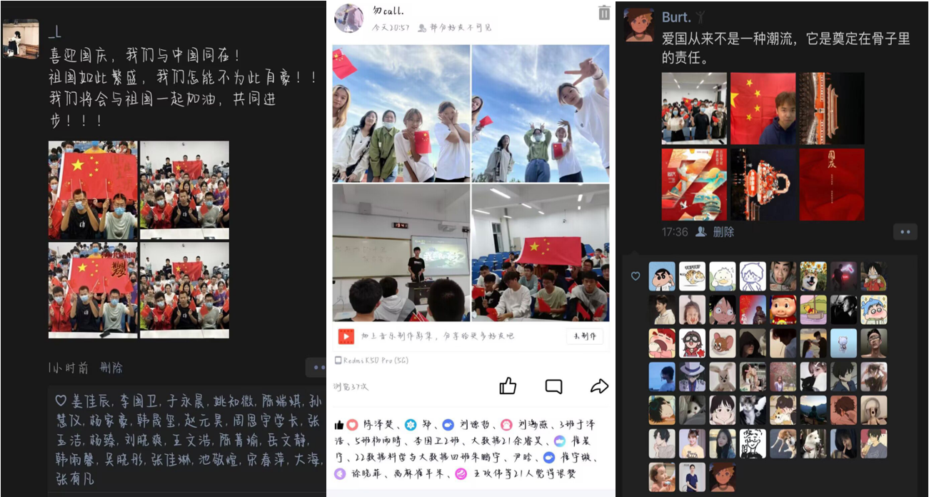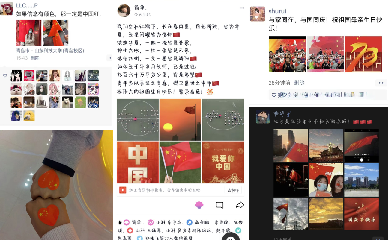 “与国旗合影,是一件神圣、庄严的事,为自己伟大祖国感到深深自豪,愿祖国更加繁荣昌盛!”“每当看到迎风飘扬的国旗,都会感到热血沸腾,心中充满的是对祖国的崇敬和对未来的憧憬。我爱你中国,为您点赞!”国庆当天,同学们纷纷在朋友圈等网络平台分享照片并表白祖国。