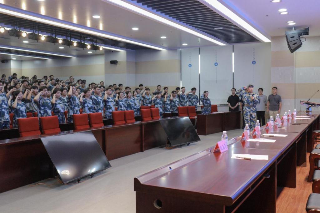随后,尹建为参训学员授军训连旗。全体参训员工紧握右拳,庄严宣誓:“服从命令,听从指挥;刻苦训练,奋勇争先;团结互助,共创辉煌!”