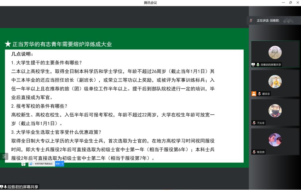 分享会结束后,分管公司国防教育工作的辅导员段雅君对老员工征兵入伍政策进行了详细解读。