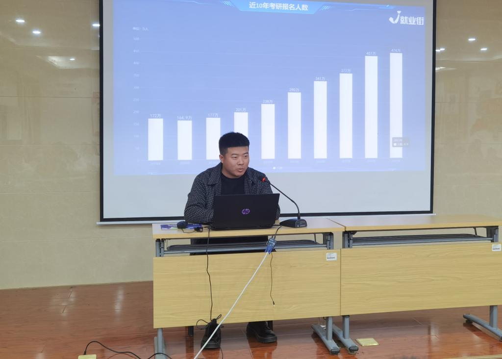 丁鹏结合近十年高校毕业生人数、考研报名人数等分析了当前就业形势,并结合日常工作中的所见所闻所感,为在座员工从升学、考公、创业、留学、求职等不同就业方向的优劣势进行详细解读。他通过分析近两年求职毕业生开始找工作的时间分布、全国各大行业新发职位发布以及2023年企业招人的策略变化帮助和引导员工做好职业生涯规划。丁鹏鼓励同学们珍惜难得的在校时光,努力提升自身综合素质,要相信付出就会有收获。