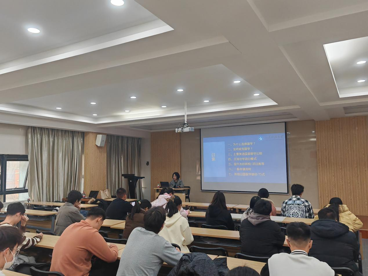 刘洁从“为什么选择留学?”这一问题展开,结合往年留学数据和国内留学大环境,详细分析了国(境)外留学项目的优势,让同学们对出国(境)留学有了全新的认识。同时,她从教育发达程度、公司排名、学制长短、费用性价比、成绩要求等方面对主要英语国家的留学情况进行了比较,并指导同学们从大一到大四如何做好留学规划。最后,刘洁详细介绍了“3+1+1”联合培养项目、“4+1”本升硕项目、学期交流访学等项目模式,对国外友好院校和项目进行推介。