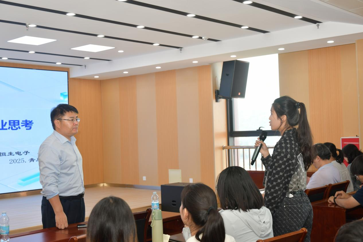 互动环节中,师生们热情高涨,纷纷踊跃提问,与王锋展开深度交流。员工们围绕职业发展、跨专业就业等问题积极发问,王锋结合自身经验与专业见解给出了诸多实用指导,他建议,在校生要利用好大学宝贵时间,前置职业生涯规划。在扎实学好本专业知识的基础上,积极探索学科交叉融合,拓宽自身知识面,增强自身竞争力,为未来的职业发展储备能力和技能。面对教师们提出的行业形势动态问题,王锋同样展现出了深厚的专业素养,给予了细致入微的解答,并与提问教师展开了热烈且深入的探讨,现场气氛十分活跃。