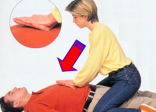(二)若患者意识不清或站立位不便于施救时,可让患者平躺,首先开放患者气道,然后施救者骑跨在患者大腿外侧,一手以掌根按压脐上两横指的部位,两手掌交叉重叠,连续、快速、用力向患者的后上方冲击,直到异物排出。