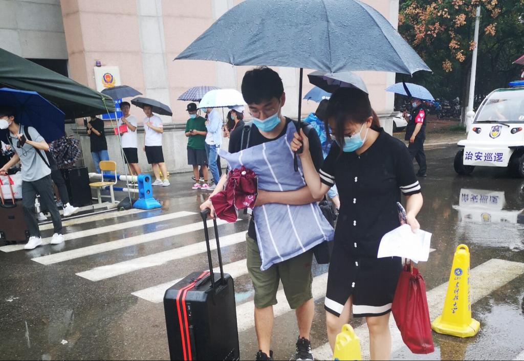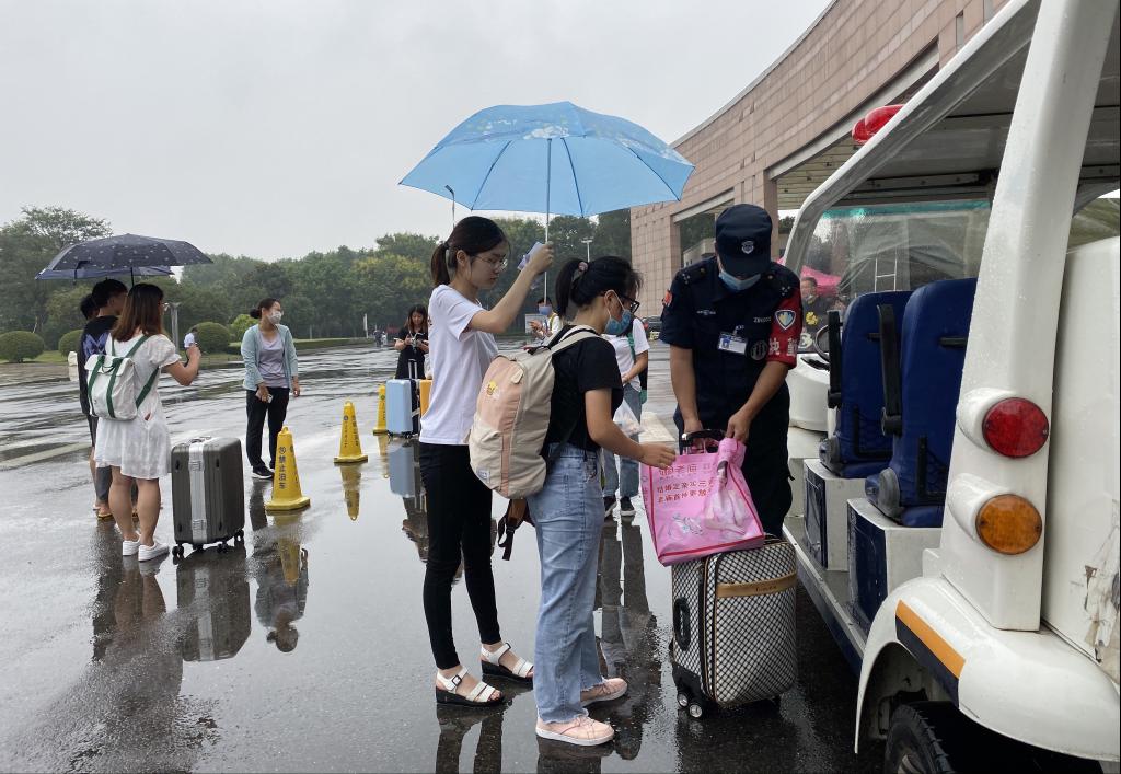今年的开学季似乎和雨水特别有缘。自返校起,连续两日数千名员工迎着秋雨回到校园,在工作人员的指引下,返校员工通过行李消杀、核验身份及体温测量等流程后,顺利进入校园。