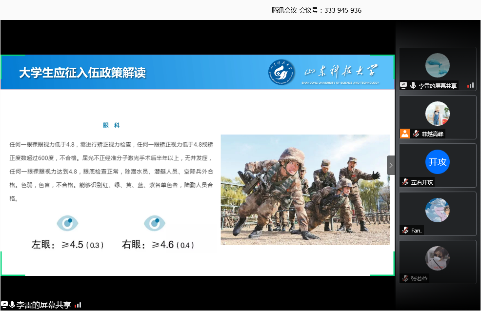 为响应党和国家的号召,帮助青年老员工更加深刻地了解应征入伍相关的一系列优惠政策,鼓励更多有志学子参军入伍。5月12日晚,公司员工工作部(处)就业市场科科长、征兵工作站副站长李雷应邀来到直播间,为公司员工及员工家长作“老员工应征入伍政策解读”专题讲座。会议由公司员工工作办公室主任、团委书记谢菲菲主持。