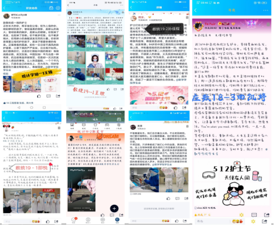 “大爱无疆的,是你。你因长时间带着防护眼罩,脸上被压出了一道道显眼的压痕,有些地方还出现了脓包。当记者采访你时,还笑称这是天使印记。你的笑容,是大爱无疆,你的压痕,是为了千千万万的病人。你将你的爱,倾注在了每一位病人的身上,为他们筑起生命的长城。”数统2019-1班孙玉龙如是分享。应数2019-2班李泽睿在QQ空间更新说:“在口罩和防护服的后面,我看不到她们的样子,但我们知道她是谁;我们不知道她们的名字,但我知道天使就在身边……”。