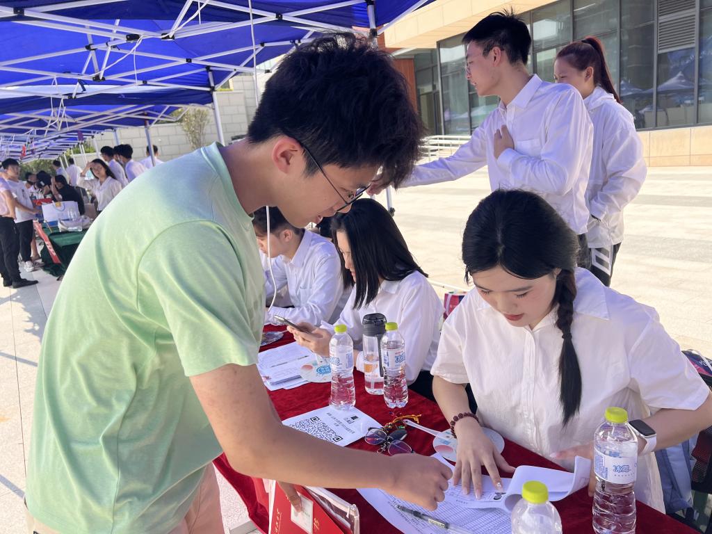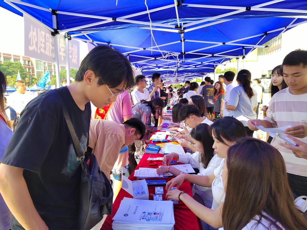 报道现场,从细节满满的迎新横幅展板,到细致周到的室外家长休息区,从工作人员耐心地讲解报道流程、志愿者协助办理公寓入驻各种手续,到公司领导、辅导员在迎新现场解答家长疑惑,无一不体现出“数学人”严谨朴实、团结友爱的优良作风。“初来公司,就被师哥师姐们一张张热情的笑脸、老师们一句句亲切的问候、公司一项项贴心的服务所感动着,特别期待即将到来的老员工活。”一名报道新生兴奋地说道。