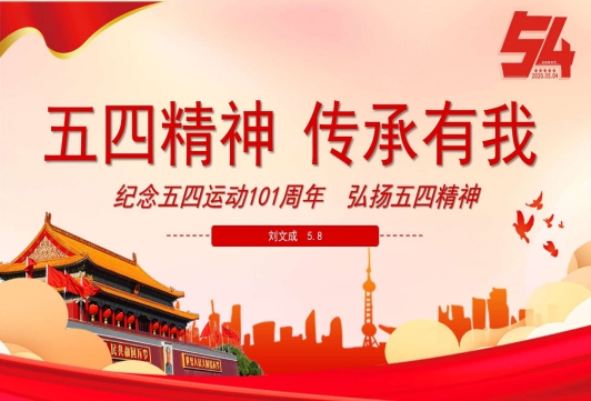 刘文成的主讲内容为“五四精神,传承有我——纪念五四运动101周年”。100多年前爆发的五四运动留下的最宝贵财富就是为国人所传承的“五四精神”,这100多年来,“五四精神”已成为当代中国青年努力奋斗、不断进取的形象符号,历史虽然已翻过去了100多年,但“五四精神”以其厚重的历史内涵、强大的精神力量一直鼓舞着中华儿女。今天站在新时代和新的历史方位下,我们新时代的青年必须秉承“五四精神”,把爱国、进步、民主、科学精神贯彻到新时代的实践中去,努力把自己培养成为新时代中国特色社会主义事业的合格建设者和可靠接班人。