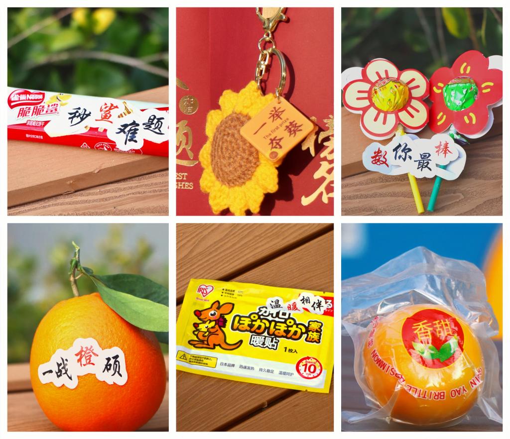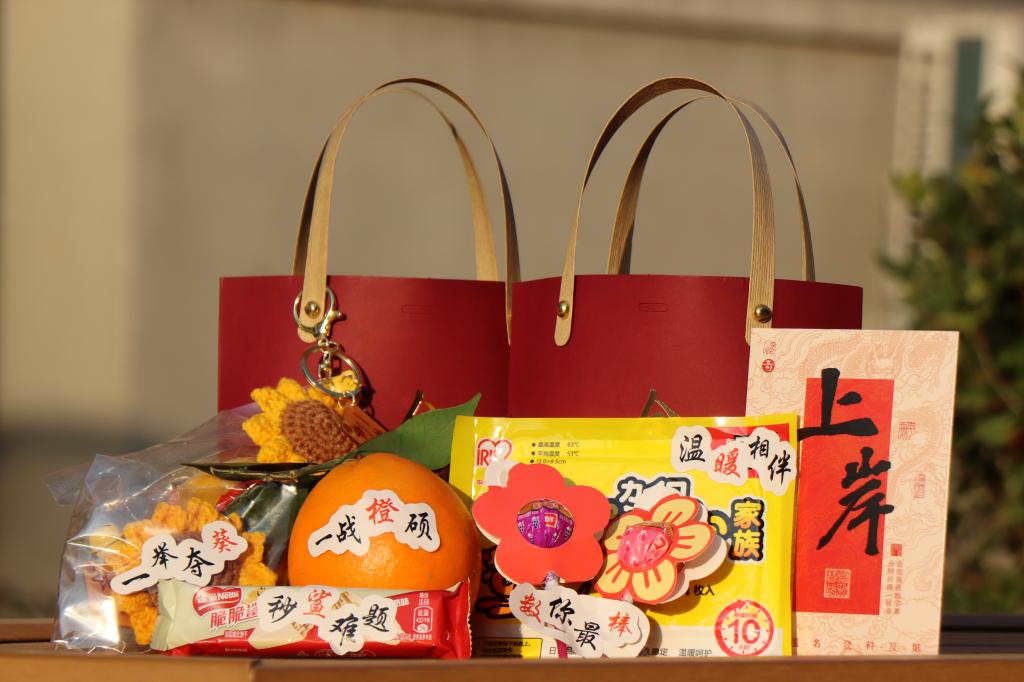 礼包内有公司老师们的温暖祝福和贴心关怀,也有一系列寓意深远的小礼物:一战“橙”硕寓意的橙子,心想“柿”成寓意的柿子,一举夺“葵”寓意的向日葵钥匙扣,温“暖”相伴的暖宝宝,还有“‘数’你最‘棒’”的棒棒糖,从选择礼品、策划创意到分装、发放,全部由公司的师生们亲手完成,希望每位考研学子都能顺利应考,出色发挥,一战上岸。