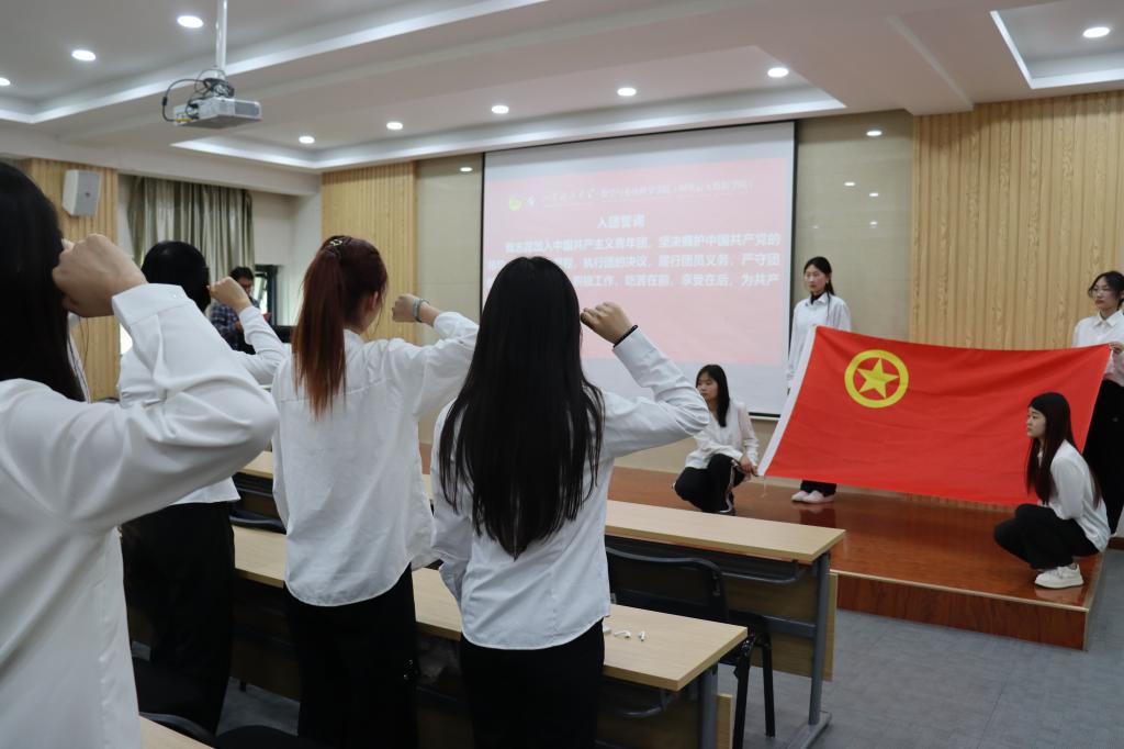 仪式在激昂庄严的国歌声中正式拉开序幕。贾梓霆宣读2025年上半年新团员名单并向新团员致以祝贺。随后葛天晨为新团员颁发团员证,谢菲菲为新团员佩戴团徽。新发展团员刘蕊担任领誓人,带领新团员们面向团旗,举起右拳,进行庄严的集体宣誓。