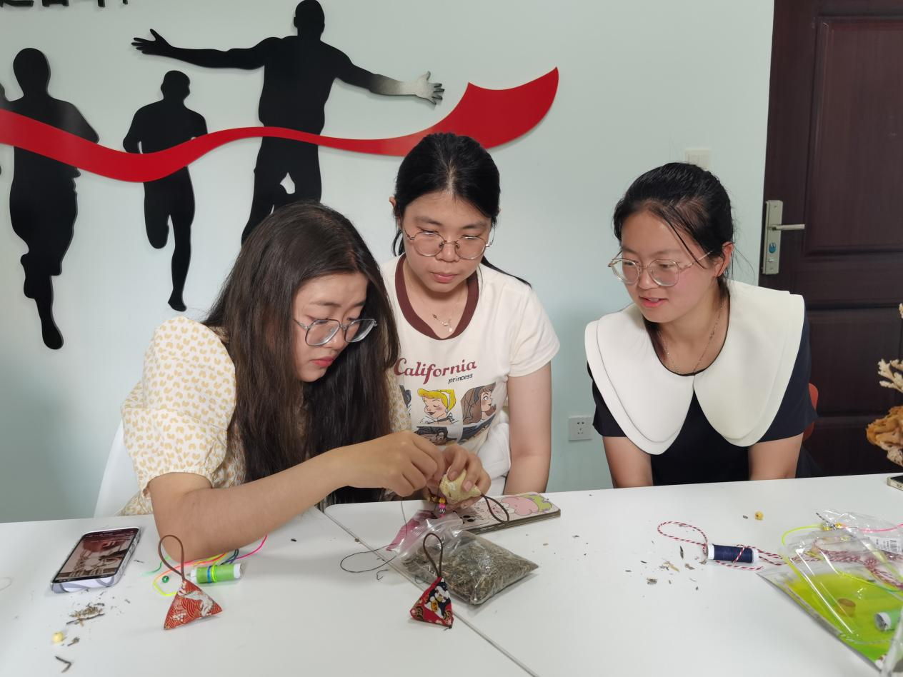 活动伊始,辅导员段雪萍介绍了端午节的由来及五彩绳、香包的美好象征和寓意,增强了大家对中华民族传统文化以及民俗节日的认知。师生们还一起分享了各自家乡的端午节习俗,大家有说有笑,仔细研究香包的制作步骤,把飘着清香的香料塞进颜色鲜艳的香包里,细心缝制,一个大小适中、外表精美、香味浓厚的香包就做好了。接着,大家把五种颜色的丝线编成美丽的手绳,为彼此送上端午节祝福。活动现场温馨喜乐,大家不仅了解了端午节的传统习俗,也在制作香囊的过程中体验了动手的乐趣。